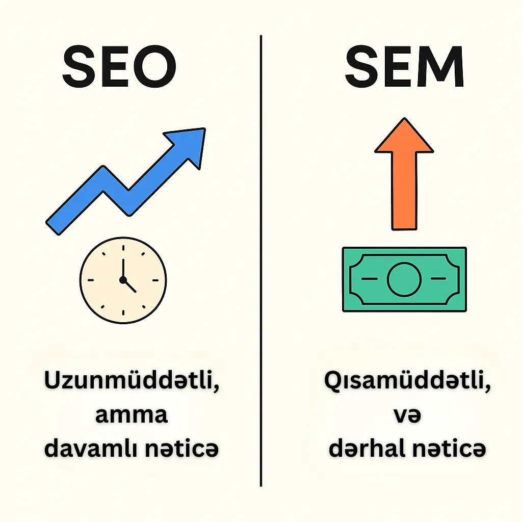 - SEO isə uzunmüddətli etibarlılıq, davamlı trafik və marka nüfuzu yaradır.